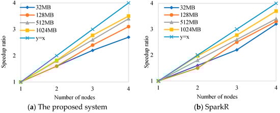 The speedup ratios of the system based on the proposed library and that based on SparkR are shown in Figure 5. It was easy to conclude that, with the increase in the number of nodes, the speedup ratios of the system and SparkR generally yielded a linear increase. When the number of nodes increased to four, the speedup ratio fluctuated around three. This shows that the computation time could be reduced approximately linearly by increasing the number of nodes.