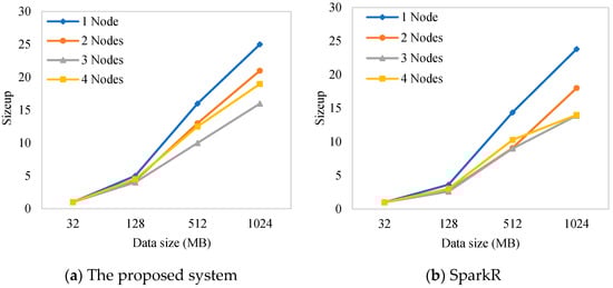 Figure 6 shows the sizeup test results for the system based on the proposed library and that based on SparkR. We concluded that, as the amount of data increased exponentially, the increase ratio of computation time of the compared implementations was very close. When the amount of data increased from 32 MB to 1024 MB, the sizeup ratio fluctuated around 15.