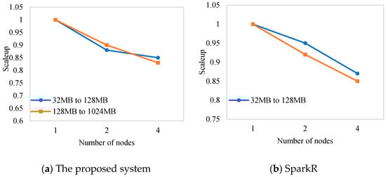 The obtained scaleup ratios for the compared systems are shown in Figure 7. It can be noted that under different data amounts, with the increase in the number of nodes, the scaleup ratios of the system based on the proposed library and that based on SparkR were kept between 0.8 and 1.0, which indicated that both systems exhibited good scalability and could provide support for data of different scales.