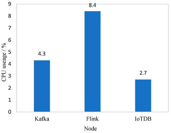 Due to the slow transmission rate of the original Chu River dataset, the transmission rate of the source data was increased to 500 ms/piece in the experiment. The CPU usage of each node is shown in Figure 8.