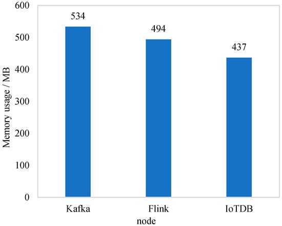 The experiment tested the memory usage of key nodes of the system, and the experimental results are shown in Figure 9. Kafka had the highest usage of memory, reaching 534 MB, while Flink and IoTDB had low usage of memory.