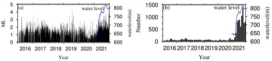 - The distribution of pre-impoundment earthquakes in the reservoir area is mainly controlled by regional stress fields and faults. As the impoundment proceeds, the number of earthquakes increases significantly, especially small and microearthquakes. These earthquakes are clustered in Hulukou town and dominantly distributed along the north-northeastern Sikaijiaoji and Jinsha Rivers, the north-northwestern Zemuhe fault and Heishuihe tributary, and the south-southeastern Xiaojiang fault and Jinsha River, showing an overall “Y-shaped” pattern. In addition, the number of earthquakes in the Ludian aftershock zone enormously decreases;