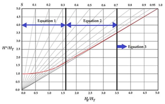 The linear weir drowning analysis developed by Villemonte (1947) [40] was the most applied method for labyrinth weirs under drowning conditions. However, at the beginning of the century, Tullis et al. (2007) [38] developed a dimensionless relationship for drowning heads in labyrinth weirs, obtaining an average error of up to 0.9%. Figure 2 shows the function describing drowning at the weir, which was divided into three sections to better explain its behavior and is represented by Equations (1)–(3).
