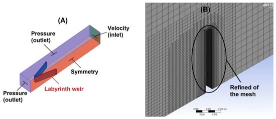 The ANSYS-FLUENT Geometry module was used to build the conceptual models. The Meshing module was used to generate the mesh, where they were spatially discretized using predominantly hexahedral meshes. The advantage of this type of mesh is the reduction in the number of cells and the improvement in the convergence of the solution [50]. The computational meshes were refined in the vicinity of the weir wall (Figure 3B), where the turbulence is dissipated, and its behavior has a significant effect on the results.