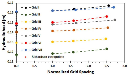 Based on Richardson’s extrapolation for the two finer grids, an estimate of the hydraulic head value for zero-grid spacing was obtained. The graph in Figure 4 shows the hydraulic head with variable grid spacing; as the grid spacing reduced, the hydraulic head approached an asymptotic value of zero mesh spacing.
