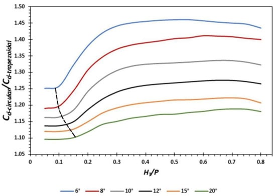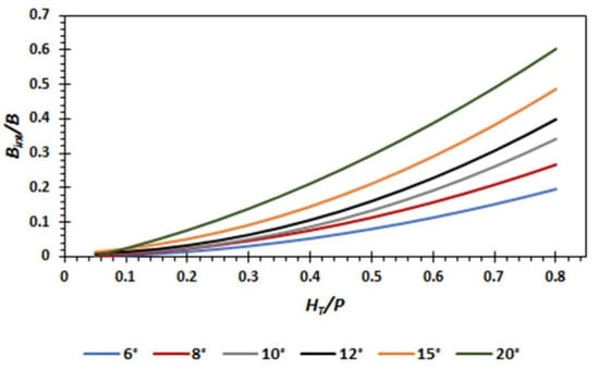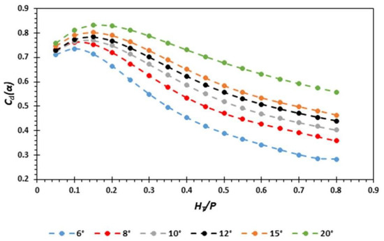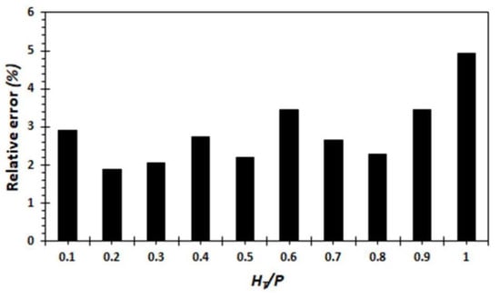 The mean absolute error of the discharge coefficient (MAE) was 0.0128, and the relative percentage error varied from 1.89% to 4.92%. In Figure 5, the relative percentage errors of the discharge coefficient as a function of the ratio HT/P are presented.