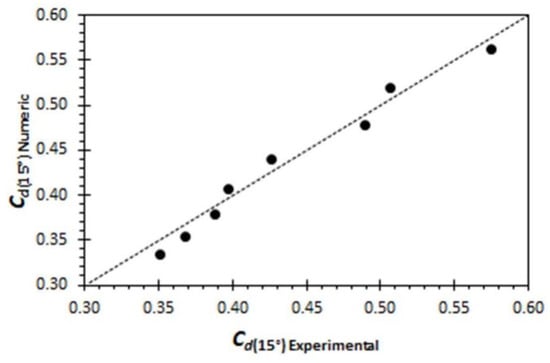 The calculated coefficient of determination was R2 = 0.984, which confirms the agreement between the numerically obtained discharge coefficients and the experimental values. In the graph in Figure 6, the numerical results are compared with the experimental results; the dotted diagonal line corresponds to a perfect fit.