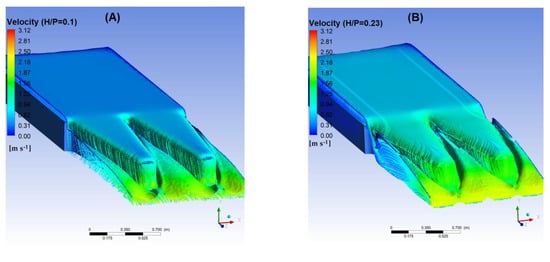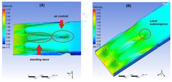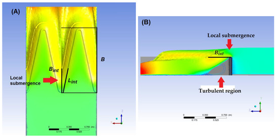 In the simulation of free-surface flows, it is important to define the boundary conditions appropriately at the inlet and outlet of the model domain. In this work, the boundary conditions implemented in ANSYS-FLUENT were applied at the inlet and outlet of the domain, with the fluid velocity as inlet and atmospheric pressure as outlet. The approach of the boundary conditions (Figure 3A) and definition of the fluid properties are specified in Table 2.