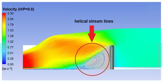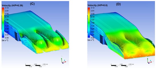 Seven different grids are presented in this study. To perform the GCI analysis, the hydraulic head (h1, h2, h3) was considered as a control variable to estimate discretization errors. The flows used were as follows: QI = 0.2036 m3 s−1, QII = 0.2003 m3 s−1, QIII = 0.2137 m3 s−1, QIV = 0.2170 m3 s−1, QV = 0.2149 m3 s−1, QVI = 0.2036 m3 s−1, and QVII = 0.1915 m3 s−1 for the grids: I, II, III, IV, V, VI, and VII, respectively. The GCI calculations of the numerical solutions are summarized in Table 4; the asymptotic ranges of convergence obtained are approximately equal to 1. Therefore, the numerical solutions are within the asymptotic range. In the present work, the hydraulic head was achieved with a maximum error of up to 2.80%, corresponding to grid II.