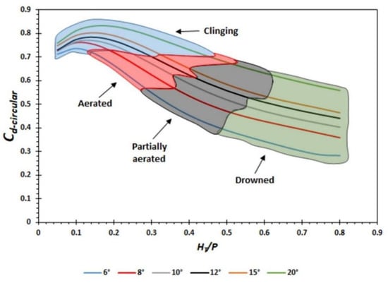 The increase in discharge flow over the weir generates different aeration conditions; these have been identified by some researchers and have already been included in design curves, through the value of the discharge coefficient [25,26]. Lux and Hinchliff (1985) [25] identified three types of aeration: aerated, transitional (partially aerated), and suppressed (drowned). However, for Falvey (2003) [27], there are four types of aeration conditions: cavity, atmospheric, sub-atmospheric, and pressure. On the other hand, Crookston and Tullis (2012) [26] also reported four types of aeration: clinging, aerated, partially aerated, and drowned, and indicated that aeration conditions can produce pressure fluctuations at the sidewalls of the weir, low frequency sound, and vibrations. In addition, previous studies point to the labyrinth weir as an excellent aeration control structure. Examples of this are the work of Hauser (1996) [28], who describes the methods for the design of this type of weir, taking into consideration the aeration conditions during discharge. Wormleaton and Soufani (1998) [29] and Wormleaton and Tsan (2000) [30] found that a rectangular labyrinth weir has better aeration efficiency than a triangular labyrinth weir and that the latter is better than a linear one.