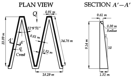 - Lux, F., III; Hinchliff, D. Design and construction of labyrinth spillways. In Proceedings of the 15th International Congress on Large Dams, International Commission on Large Dams, Paris, France, 15–19 November 1985. [Google Scholar]