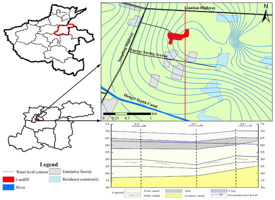 Located in the eastern part of Henan Province, China, Kaifeng has a total area of 6444 km2, including 362 km2 of urban area and 67 km2 of built-up area. Kaifeng is located 500 km from the Yellow Sea to the east. There are many rivers and lakes in Kaifeng. These belong to two major water systems, the Yellow River and the Huai River, and the water resources mainly include surface water and shallow groundwater. The main residential water in the study area comes from groundwater. According to the data of the seventh census, as of 1 November 2020, the resident population of Kaifeng was 4,824,016. The landfill was built in 1997 and expanded in 2011, and has been operating for 18 years, with a current landfill volume of four to five million tons. The geographical location map of the study area is illustrated in Figure 1.