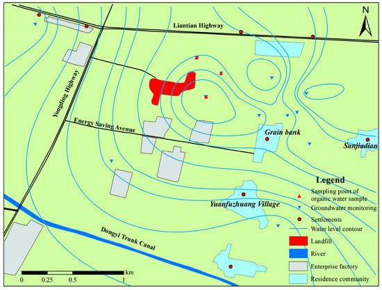 Landfill is a common way to dispose of solid waste in most countries and regions [1]. Improper landfill management or aging facilities can cause leachate to flow into groundwater and change the chemical components of groundwater [2,3]. Leachate is an effluent containing organic matter and heavy metal ions due to the influence of solid waste [4,5]. Leachate causes changes in the contents of anions and cations in groundwater as well as an increase in the content of heavy metal ions, effects which can pollute groundwater. Common groundwater contamination includes heavy metal contamination, “tri-nitrogen” contamination, fluoride contamination, arsenic contamination, and organic contamination [6]. Heavy metal ions are difficult to biodegrade in the groundwater circulation system. Additionally, because they are persistent, bio-accumulative, carcinogenic, and endocrine-disrupting, heavy metals can continue to degrade the groundwater environment and threaten human life and health [7,8,9,10,11,12,13,14]; fluoride in groundwater is a major cause of dental fluorosis and bone wrinkles in people around the world [15]; organic contamination poses a moderate to high risk to aquatic organisms in groundwater [16]. Excess fluoride in drinking water can negatively affect human intellectual development, reproductive hormone levels and protoplasm, and influence the enzymatic, digestive, urinary, and cardiovascular systems to varying degrees [17]. Excess lead has systemic effects on the human body, including the human respiratory, cardiovascular, digestive, hematological, neurological, and reproductive systems, and affects children’s intelligence quotient [18]. In recent years, many scholars at home and abroad have explored groundwater pollutant sources, spatial distribution characteristics, and pollution using different methods, and have achieved remarkable results. For example, multivariate analysis methods such as Pearson correlation coefficient analysis and principal component analysis were employed to investigate sources of such metals [19] and to determine human health risks using the chronic dose index for toxic and metal-like metals [20]. The multivariate statistical method was adopted to estimate spatial distributions and pollution evaluation [21] and the landfill water pollution index, entropy-weighted water quality index (EWQI), and groundwater pollution indices were employed to evaluate water quality, etc. [22,23,24].
