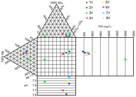 The chemical classification of water is based on the relative content and proportional relationship of the major anions and cations in the water body. A Durov diagram is a common graph which expresses the type of water chemistry, allowing for the visualization of the relationship between groundwater water chemical characteristics, salinity and pH. Durov plots of water samples from the study area are shown in Figure 3; the cation concentration in groundwater is (in descending order): Ca2+ > Na+ > Mg2+ > K+, the anion concentration is such that HCO3− > Cl− > SO42−, and the water chemistry type is an HCO3−—Ca·Na type water, and the range of total dissolved solids (TDS) in 87.5% of the water samples is less than 1 g/L.