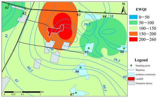 - According to the EWQI calculation results, the overall water quality in the study area is above the medium level, and the local water quality level is poor. Analyzing the causes, the groundwater in the study area was found to be mainly contaminated by NH4+-N and Mn. Due to the presence of farmed land around the upstream wells, the increase in the concentration of groundwater NH4+-N was caused by the result of long-term fertilization; other wells downstream were also contaminated to varying degrees and so it was determined that the leachate discharged from the landfill pile may have been the cause;