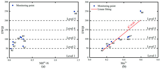 Groundwater NH4+-N and Mn v. EWQI scatter plots. (a) Scatterplot of NH4+-N EWQI levels in groundwater; (b) Scatterplot of Mn EWQI levels in groundwater.