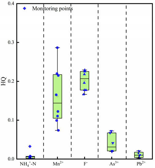 Risk levels that do not produce adverse or deleterious health effects in exposed populations include acceptable carcinogenic risk levels for carcinogens and acceptable quotients for non-carcinogens [44,45,46,47]. According to HJ 25.3-2019, the acceptable carcinogenic risk level for a single contaminant in the criteria is 10−6 and the acceptable HQ for a single contaminant is 1. Based on the health risk evaluation model, five parameters of NH4+-N, Mn, As, F− and Pb in the groundwater of the study area were selected to evaluate the potential risk of the groundwater drinking pathway to humans. The HQ values of NH4+-N, Mn, As, F− and Pb in the study area were calculated according to Equations (12) and (13). As illustrated in Figure 6, the hazard quotient (HQ) values for NH4+-N, Mn, As, F− and Pb varied in the following ranges: 9.14 × 10−4—0.03; 0.07—0.22; 0.02—0.07; 0.16—0.23; and 0.01—0.13, respectively (all of which are less than 1, so the potential risks to human health can be ignored). In summary, the ion concentration can be considered to have no effect on human health when it is within permissible values.