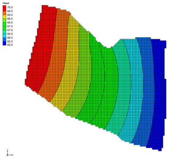Based on the currently available historical water level dynamic data and knowledge of the flow field in the assessment area, the groundwater flow field was obtained, as shown in Figure 7, after the model parameters were identified and verified for the purpose of this simulation. The distribution of this simulated flow field is similar to the regional measured iso-water level, the difference of water level values is small, and the direction of groundwater flow is consistent, which satisfies the relevant requirements in the Working Requirements for Groundwater Resources Management Model (GBT14497-93) [48]. Therefore, the established simulation model conforms to the hydrogeological conditions of the assessment area and can be used for further studies.