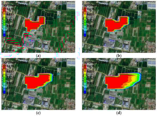 Pb concentration distribution map. (a) After 1 year; (b) After 5 years; (c) After 10 years; (d) After 20 years.
