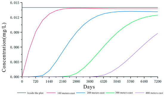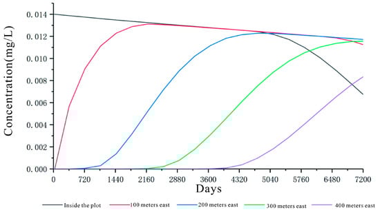 From Figure 11 and Figure 12, it can be seen that the concentration of pollutants in the landfill site gradually decreased with time after 30 days of short-term release (curve “within the site”), the contamination plume kept moving downstream to the east, driven by the groundwater flow field, and the area of exceedance gradually decreased with time during the process. Among them, after one year, the pollution plume moved 42.84 m to the east, the central concentration of the pollution plume was 0.0138 mg/L, and the overall area of exceedance was 82,984 m2; after 5 years, it had moved 106.16 m to the east, which made the groundwater quality in some areas of the fish pond exceed acceptable standards, and the central concentration of the pollution plume was reduced to 0.0134 mg/L, with an overall area of exceedance of 75,407 m2; after 10 years, the source of excessive pollution migrated eastward to a distance of 185.71 m, and the concentration of the center of the pollution plume decreased to 0.0128 mg/L, with an overall area of exceedance of 65,345 m2; 20 years later, the pollution plume had left the landfill and migrated 338.21 m eastward through the fish pond, which had a greater impact on the groundwater quality under the surrounding farmland, and the concentration of the center of the pollution plume was reduced to 0.0117 mg/L, and the area of exceedance was 44,255 m2.
