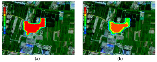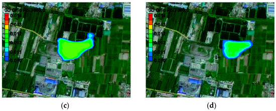 As illustrated in Figure 9 and Figure 10, under continuous release conditions, Pb maintains a constant concentration of 0.014 mg/L at points within the landfill area, the contamination plume continuously spreads downstream to the east, driven by the groundwater flow field, and the exceedance area gradually increases with time during the process. Among them, after one year, the excessive pollution plume migrated eastward by some 42.7 m, and the area of exceedance was 92,314 m2; after 5 years, the excessive pollution plume spread significantly to the east by some 107.7 m, resulting in the groundwater quality of some fish ponds in its immediate vicinity exceeding the standard, and the overall area of exceedance was 118,799 m2; after 10 years, it migrated eastward by some 188.21 m, the exceeded area of fish ponds groundwater increased, and the overall area of exceedance reached 149,514 m2; after 20 years, the pollution plume has passed through the fish ponds and had a greater impact on the water quality of farmland. At this time the migration had reached 347.82 m, and the overall area of exceedance was 204,830 m2.