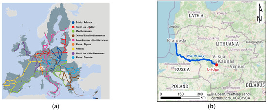 Inland waterways and waterway transport are important branches of transport in countries with a developed network of rivers and channels [1]. Several efforts have been made in the European Union aimed at the development and integration of transport networks, including inland navigation systems. During the last decade, one of the most known is the Trans-European Transport Networks (TEN–T) [2,3,4]. The main purpose of the TEN–T is the coordination and compatibility of investments in the transport networks for the continuity of people and goods movements in the EU states. This is an excellent opportunity for the development of waterways, especially for younger EU members located in the eastern, post-Soviet zone of the Union, like Lithuania and Poland. In both countries, there are river reaches of important international waterways. In Lithuania, the E–41 on the Nemunas river links the city of Kaunas with the Baltic Sea harbor Klaipeda. Another waterway, E–70, goes from Klaipeda through the harbor in Kaliningrad (Polish: Królewiec, Lithuanian: Karaliaucius) to the western European network of inland and marine waterways [5,6]. In 2016, the project of modernization and development of the E–41 started in Lithuania. In Poland, there are three waterways of international importance, namely E–30, E–40, and E–70. None of them have been modernized in the TEN–T project yet, but such an opportunity still exists.