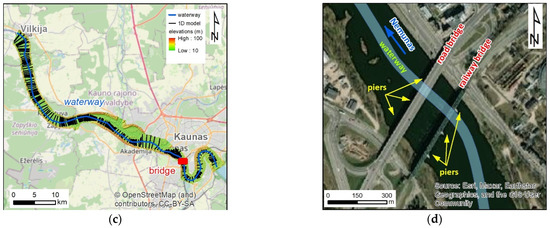 Location and elements of the investigated bridges: (a) TEN-T Core Network Corridors [42], (b) Kaunas-Klaipeda corridor and location of the bridge; (c) reach of the Nemunas Kaunas—Vilkija, (d) the bridge and its main elements.