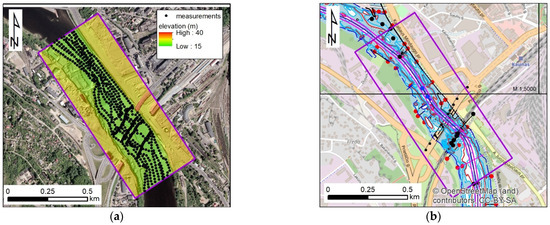 The first two types of data are used in the GIS formats. The digital terrain model of the riverbed and surrounding areas was provided by the Lithuanian company UAB”Inžinerinis projektavimas”. The DTM was prepared for the purpose of the EU Flood Directive [44] implementation in the territory of Lithuania between 2011–2012. The raster is stored in GRID format with the resolution 1 m x 1 m. The DTM covers the areas where the flood hazard and flood risk were determined in Lithuania according to the requirements of the EU Flood Directive. It encompasses all the greater rivers with their valleys including also important inundation areas. However, the part important for this research is smaller. As it is shown in Figure 3a, it consists of the riverbed under the bridge with short sections upstream and downstream, plus the banks and part of the floodplains.