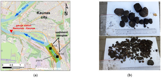 The data provided by the UAB “Inžinerinis projektavimas” also includes the samples of bottom sediment taken along the reach from the dam of the Kaunas reservoir to the village called Vilkija (Figure 1b,c). Near the bridge, two sampling points are located. In Figure 4a, these are points denoted as S-12 and S-13. Unfortunately, the long-term erosion processes below the Kaunas dam induced strong armoring of the river bottom below. The examples of the material found at the bottom are presented in Figure 4b. These are stones of different sizes up to 10 cm. Such a bottom should not be treated as alluvial. It is rather a stable bottom, but the assessment of the bed roughness is not possible based on sediment samples. Hence, this factor should be treated as uncertain.