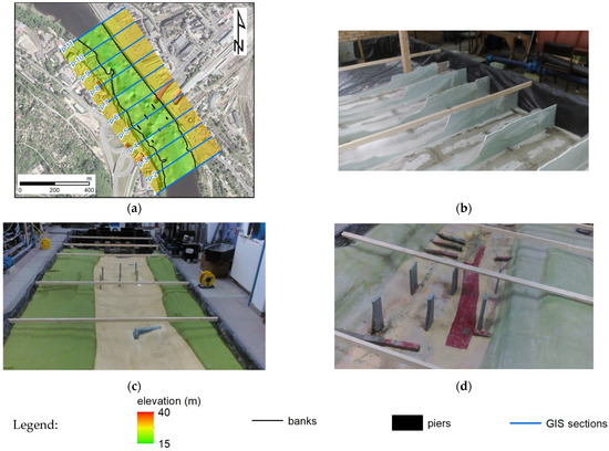 Physical model preparation: (a) DTM with interpolated bathymetry, (b) the cross-sections, (c) the final version, (d) piers, spur dikes, and waterway.