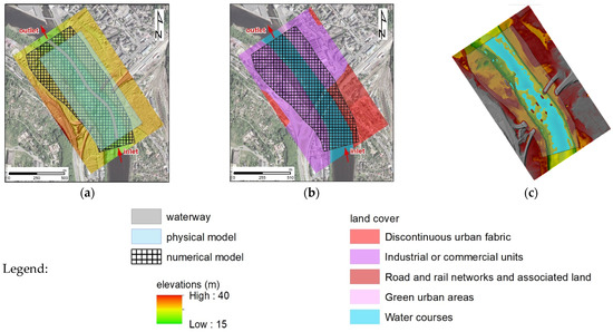 Geometrical properties of the numerical model: (a) the modeled area with additional elements, (b) the land cover from Corine 2018 database, (c) the modeled area in HEC-RAS.