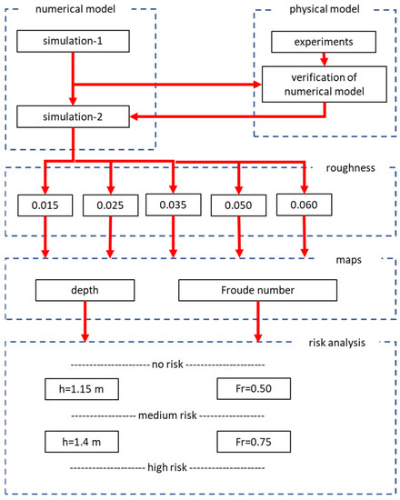 The general scheme of analyses conducted, including linking simulations and laboratory tests, is presented in Figure 7. The numerical and physical models consist of two parallel branches developed based on the same data. The first experiments influence the choice of the numerical modeling area. Then, the results of the laboratory experiments are used to validate the results of the simulations. Such a procedure was elaborated because it was assumed that the direct measurements of the water level in the analyzed object are not available for calibration of any model, neither physical nor numerical. In general, this approach is compatible with the fact that the analysis is related to extreme conditions, minimum as well as maximum flows. In such cases, any application of the model would be outside the ranges of calibration due for obvious reasons. On the other hand, the approach presented is good enough in cases when the object does not exist, e.g., in the design phase. In the next step, the numerical model enables the extension of the analyses and testing of the different roughness in the bottom. The depth maps and maps of the Froude number distributions are generated from the results of the hydrodynamic computations. And finally, the maps are reclassified according to the criteria defining the levels of risk.