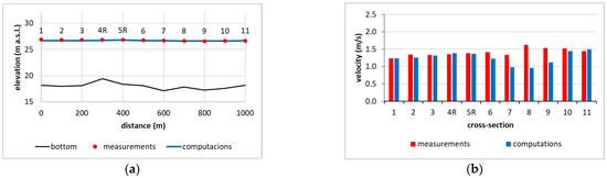 A few runs with different roughness coefficients were tested in the validation phase. The value providing the satisfactory fitness of the measurements and the computations is 0.012 s∙m−1/3. An example of the obtained results is shown in Figure 8. These are the results for simulation with Q5%. On the left (Figure 8a), the comparison of measured and computed water surface elevation can be noted. Above the red dots representing the measurements, the numbers of the cross-sections are denoted. The numbers are consistent with Figure 5a. The letter R added to cross-sections 4 and 5 means the right side of the cross-sections, which are split by the piers. The compatibility of water surfaces seems to be good. It is also confirmed in the values of RMSE presented in Table 7. The relative error for the water level expressed in % varies between 1.04 and 3.33%.