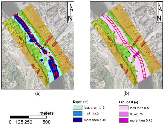 The first example is presented in Figure 9. These are results obtained in the simulation of Q95% flow with roughness 0.025 s∙m−1/3. In Figure 9a, the map of depths in the entire area of the physical modeling was presented. On the right side, the distribution of the Froude number in the same region is illustrated. The waterway is denoted as a belt of red lines. It is well visible that the most severe conditions are detected in the inlet to the bridge section, between the piers close to the right bank; i€ this case, a depth less than 1.15 m and Froude number greater than 0.75. However, there are also other locations where the assumed criteria are violated.