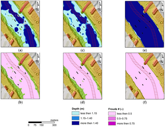 Results obtained for roughness of the bottom equal to 0.060 s m−1/3: (a) map of depth classes for Q95%, (b) distribution of Froude # for Q95%, (c) map of depth classes for Q95%, ice, (d) distribution of Froude # for Q95%, ice, (e) map of depth classes for Q50%, (f) distribution of Froude # for Q50%.