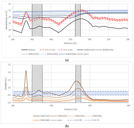 Examples of profiles under the bridge for discharge Q95%, ice: (a) water surface, (b) distribution of Froude #.