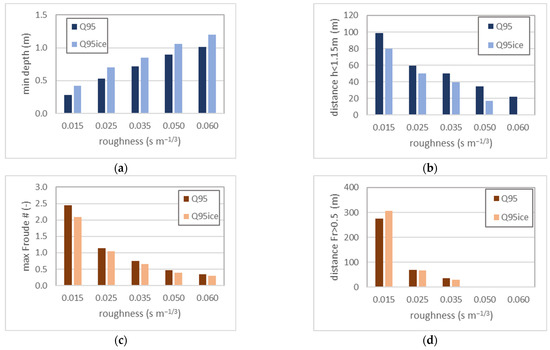 In Figure 13a, the minimum depths are presented. These results were obtained during the computations with different roughness coefficients selected for the riverbed. Obviously, the minimum depth for Q95%,ice is slightly greater than the same indicator calculated with Q95%. The difference in the magnitudes of the discharges is a proper explanation of this fact. Additionally, it may be noted that the minimum depth increases with the increasing roughness. It confirms the previous remark on the stabilizing function of friction. It could be treated as a potential solution to the problems related to the functioning of the waterway, but it should be remembered that there is another side of this phenomenon. The greater energy losses caused by higher roughness are also responsible for the increase in the water surface elevations during a flood and wider inundation areas. The consequences may be more expensive flood losses. Hence, the increase in the roughness should not be recommended as the method for coping with two small depths in existing waterways.