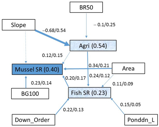 The paths of SEM show the standardized regression coefficient vs. marginal R2 of individual physical predictors (x/y) for each of the three response variables across 459 stream sites in Illinois. Mussel SR is the ultimate response variable (blue). Fish species richness (SR) and percent agricultural land in the watershed (Agri) are response variables of other environmental factors, as well as the predictors of mussel SR (light blue). All other variables are predictors (blanks) (Down_Order = order of downstream reach, Ponddn_L = distance from downstream pond, see Table 1 for the abbreviations of other predictors). The R2 for the overall model is shown in each of the blue boxes (see [6] for data sources), and its value is symbolized by the width of the arrow (solid line = statistically significant; dotted line = insignificant).
