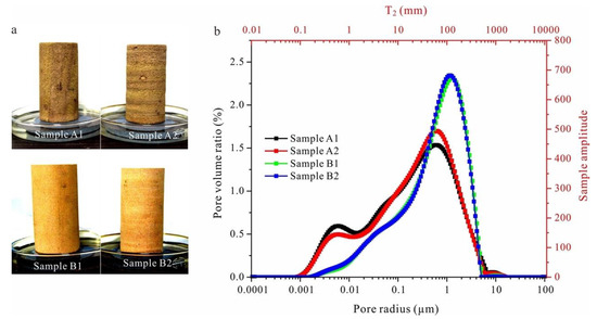 Four sandstone samples were selected for the test, as shown in Figure 1a [75]. Cylindrical samples with a diameter of 50 mm were drilled from two sandstone blocks both perpendicular and parallel to the bedding plane. After that, the cylindrical cores were cut into standard samples with a height of 100 mm. The top and bottom surface of the samples were polished to be smooth. Samples A1 and A2 were taken from the same coarse-grained sandstone, which had well-developed bedding with alternating coarse-grained strata and fine-grained strata. The mineral composition of Sample A1 and A2, derived from XRD experimental results, are shown in Table 1. After the samples were saturated in a vacuum chamber, we could obtain their porosity, and the pore size distribution curves (Figure 1b) could be calculated from the NMR T2 distributions (Figure 1b); the principle is introduced in Section 2.2. The porosity of Sample A1 was 16.97%; while the porosity of Sample A2 was 18.60%. Samples B1 and B2 were taken from the same fine-grained sandstone, which had obvious bedding as well but with no great differences in grain size between the adjacent strata. Mineral composition of Sample B1 and B2 derived from XRD experimental results are shown in Table 2. The porosity of Sample B1 was 14.93%, and the porosity of Sample B2 was 14.59%. Sample A1 and B1 were sandstones with bedding planes parallel to the axis of the cylindrical core (hereinafter marked by Par samples), while Sample A2 and B2 were sandstones with bedding planes perpendicular to the axis of the cylindrical core (hereinafter marked by Per samples). Pore size distribution curves of the four samples are shown in Figure 1b (the principle is introduced in Section 2.2).