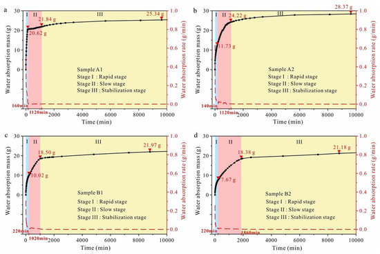 Water-absorption mass vs. time in (a) Sample A1; (b) Sample A2; (c) Sample B1 and (d) Sample B2.