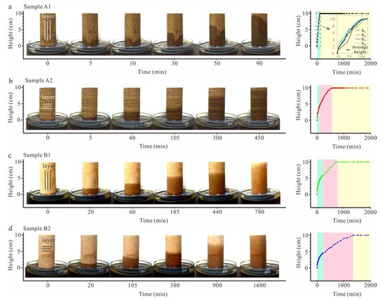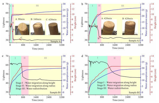 It should be noted that during the stage of water migration along the height, there was still minor radial migration. In addition, the initial difference in lightness between Specimens A and B was caused by a difference in the grain thickness of the sandstone samples.