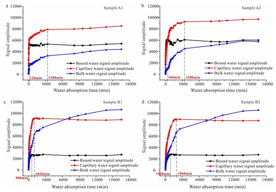 According to the pore water classification method mentioned above, the signal amplitude of different types of water can be calculated, and then its proportion in the total signal amplitude can be obtained. In sandstone with well-developed bedding, the contents of bound water, capillary water, and bulk water inside the Par sample (Sample A1) accounted for 30%, 46%, and 24%, respectively, of the total water; while in the Per sample (Sample A2), they accounted for 28%, 45%, and 27%. In sandstone with poorly developed bedding, the contents of bound water, capillary water, and bulk water inside the Par sample (Sample B1) accounted for 12%, 40%, and 48%, respectively, of the total water; while in the Per sample (Sample B2), they accounted for 12%, 40%, and 48%. This indicates that the proportions of different types of water within a rock were mainly related to its pore size distribution and had no direct correlation with layer orientation.