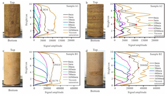 The stratified moisture distribution curves of samples with different layer directions show that the layer direction influences the water migration along the axis of the cylindrical core. In the Par sample, the signal difference is relatively small along the axis of the cylindrical core; while in the Per sample, the difference is greater. In sandstone with well-developed bedding, the maximum-to-minimum signal amplitude ratio after water absorption stabilized was 0.54 in the Par sample (Sample A1) and 0.20 in the Per sample (Sample A2). In sandstone with poorly developed bedding, the ratio was 0.82 in the Par sample (Sample B1) and 0.63 in the Per sample (Sample B2). Here, it should be noted that since moisture dissipated more rapidly at the sample surface, the data from both ends of the samples were excluded when determining the maximum and minimum signal amplitudes.