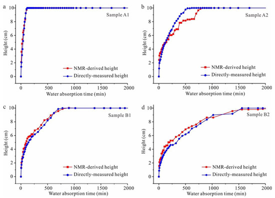 Comparison of NMR-derived and directly measured water-absorption front heights during the saturation process in (a) Sample A1; (b) Sample A2; (c) Sample B1 and (d) Sample B2.