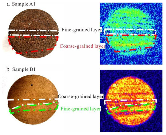 Based on the above experimental results, the layer structure and porosity had important influences on the migration and distribution of water in the samples. To study the layer structures more closely, the samples were subjected to NMR imaging. Figure 9a,b show images from the MRI of two Par samples: Samples A1 and B1, respectively. The coarse layers and fine layers of the samples can be clearly seen in the imaging results.