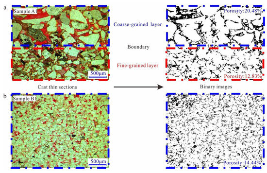 Cast thin sections and binary images of the pore structures of (a) Samples A1 and (b) B1.