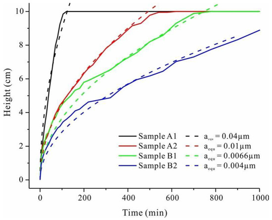 Water-absorption heights with time in (a) Sample A1; (b) Sample A2; (c) Sample B1 and (d) Sample B2.