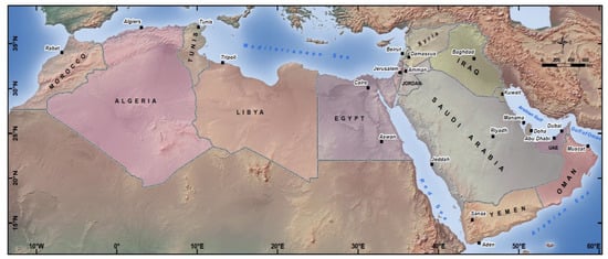 Per capita annual water resource indicators show that water scarcity is very high in the Middle East and North Africa region (MENA). As of 2022, the MENA region has an estimated population of over 463 million (5.94% of the world’s population), which is expected to reach approximately 700 million by 2050 [1]. The climate of the MENA region is generally hot and dry, although winters are mild to cold with variable rain. Annual precipitation in the MENA region ranges from 3 to 30 inches, depending on geography and topography. The Arabian peninsula, including the Gulf Cooperation Council (GCC) countries and Yemen, is in an arid region with lengthy periods of drought and low rates of annual precipitation. As a result, surface water sources are scarce and arable land is limited. Fresh groundwater and harvested rainwater represent the only conventional freshwater resources in the GCC countries, as well as in most of the other MENA countries (Figure 1).