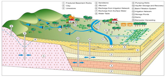 Both the surficial and outcropping fractured deep rock aquifer systems are under unsteady state conditions, where the groundwater recharge is much smaller than the extraction rate. A major part of the groundwater abstraction from these two aquifer systems goes to irrigation. According to the suitability criteria outlined by [37,66], these depleted or partially depleted aquifers have the capacity to store more water due to their thick unsaturated zones that were originally saturated with freshwater, their high transmissivity, high storage capacity, and fresh to slightly fresh native groundwater [66,67].