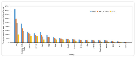Per capita renewable water resources in the MENA region for the years 1992, 2002, 2011, and 2020 (source: [89,90]).